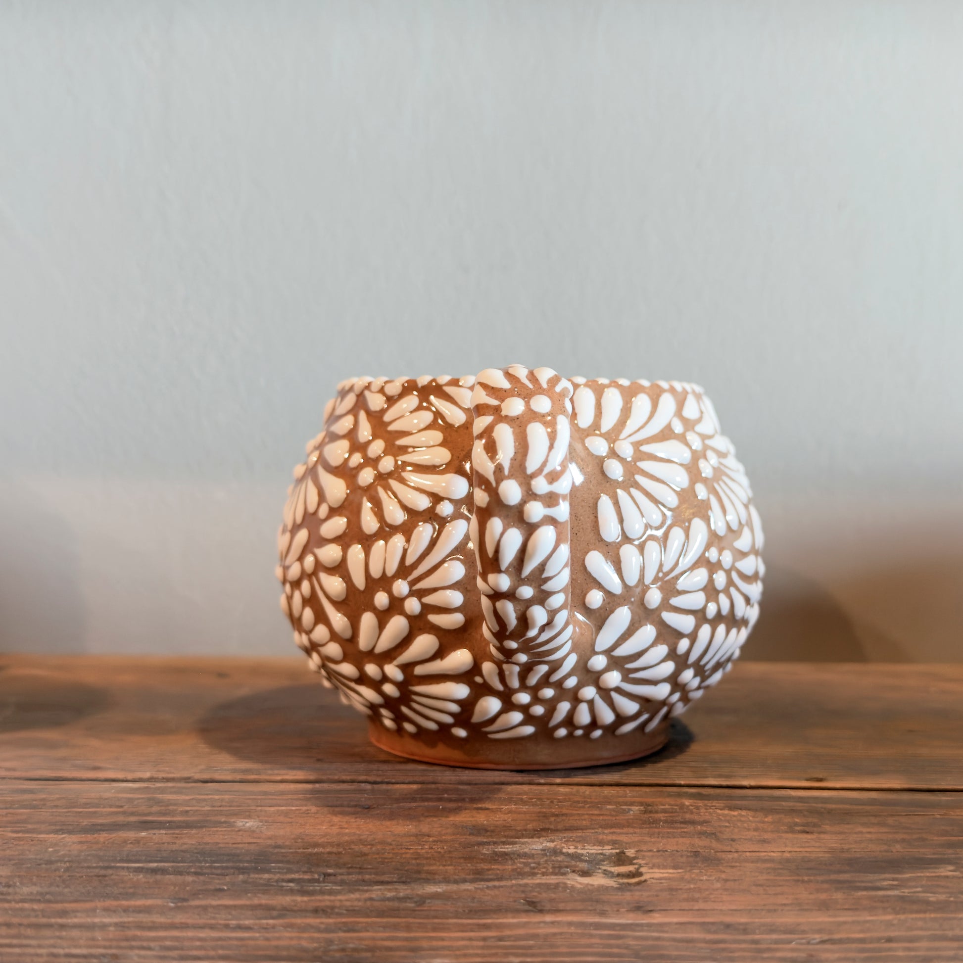 Handcrafted and hand-painted in Mexico by skilled artisans, this Mexican chocolatera in a warm Tierra (earth) tone reflects the natural beauty and authenticity of traditional Mexican pottery.