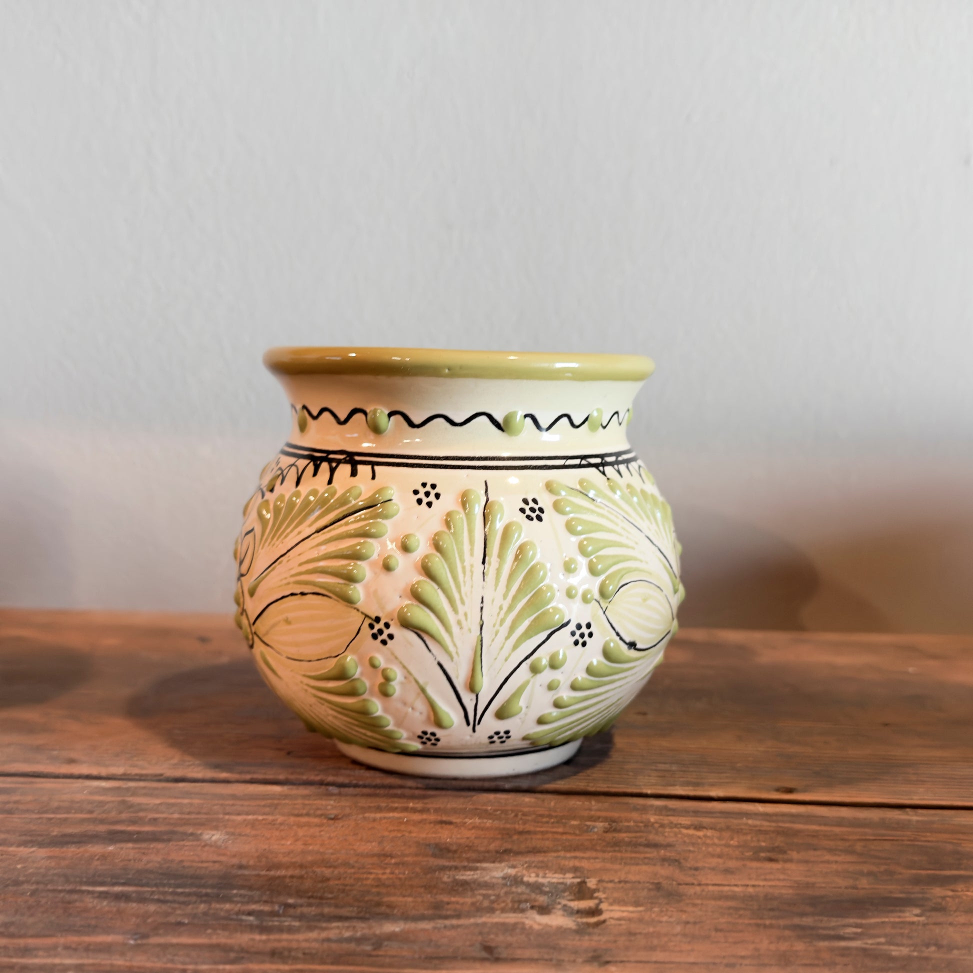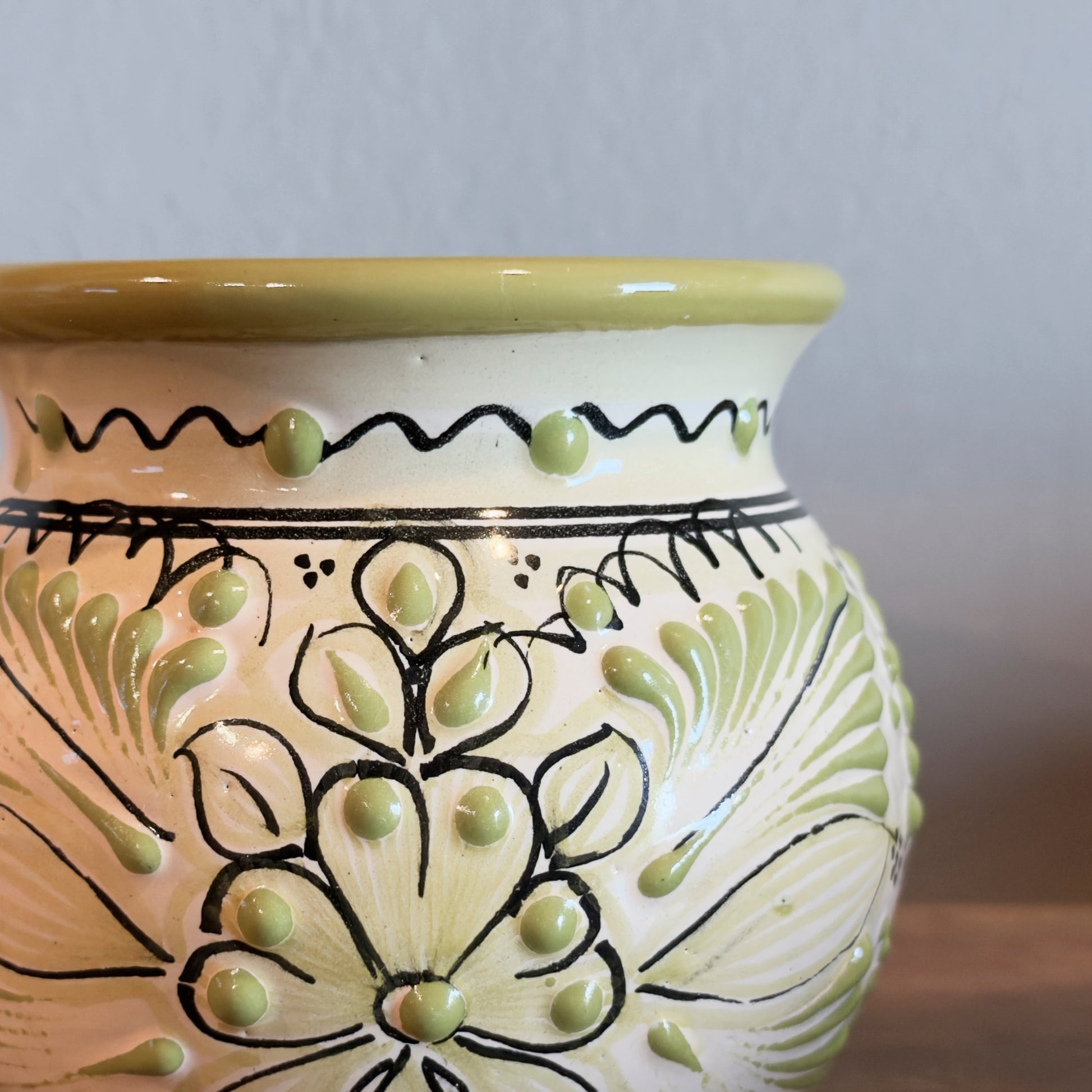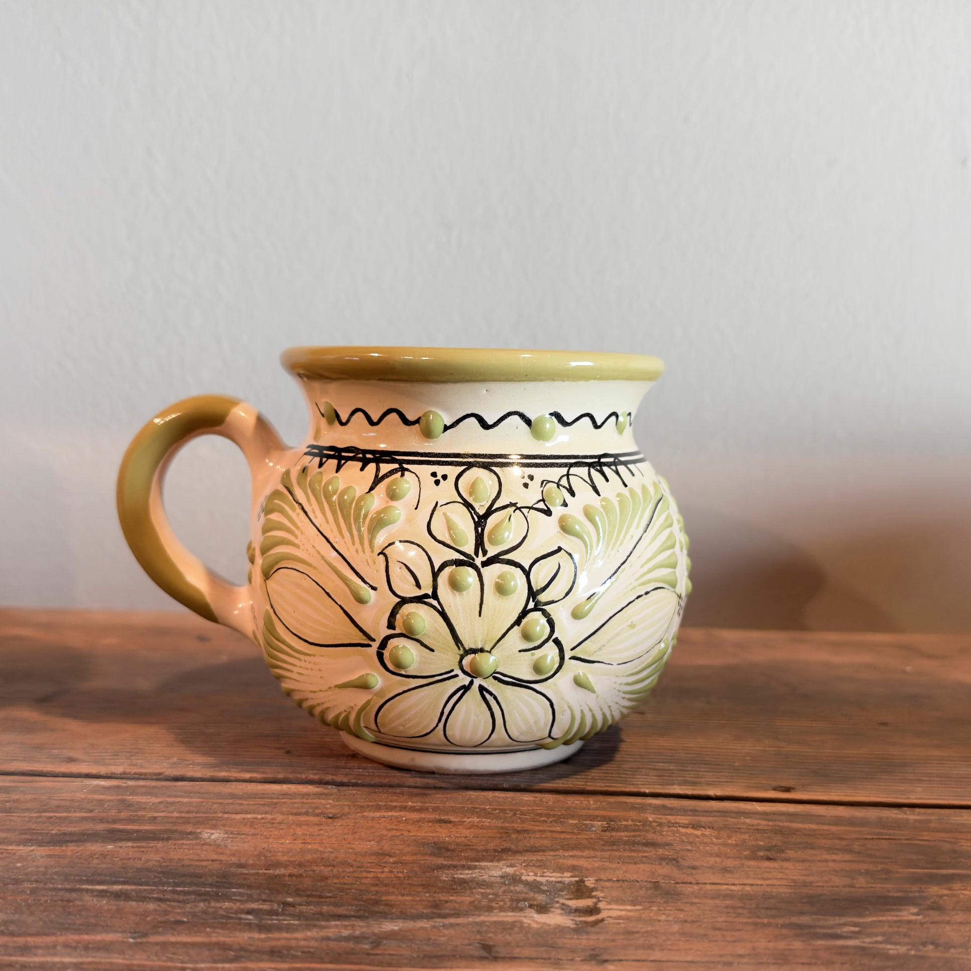 This handcrafted Mexican talavera jarrito celebrates nature through color and tradition. Hand-painted by skilled artisans in Mexico, this piece features a soft green glaze with raised white and green floral details, outlined by delicate hand-drawn accents that highlight its artisanal character.