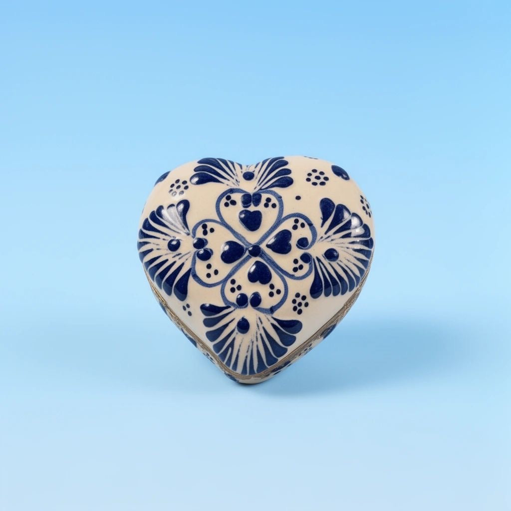 A handcrafted heart-shaped Talavera box designed to hold what matters most.