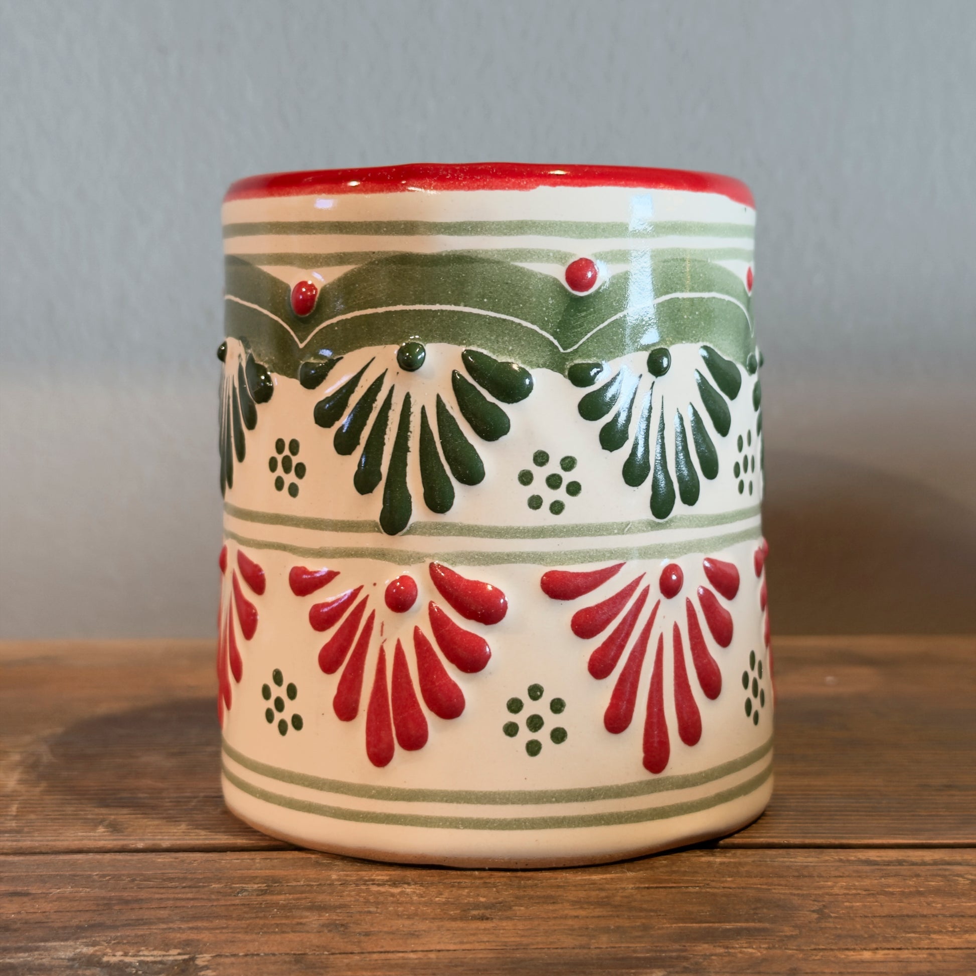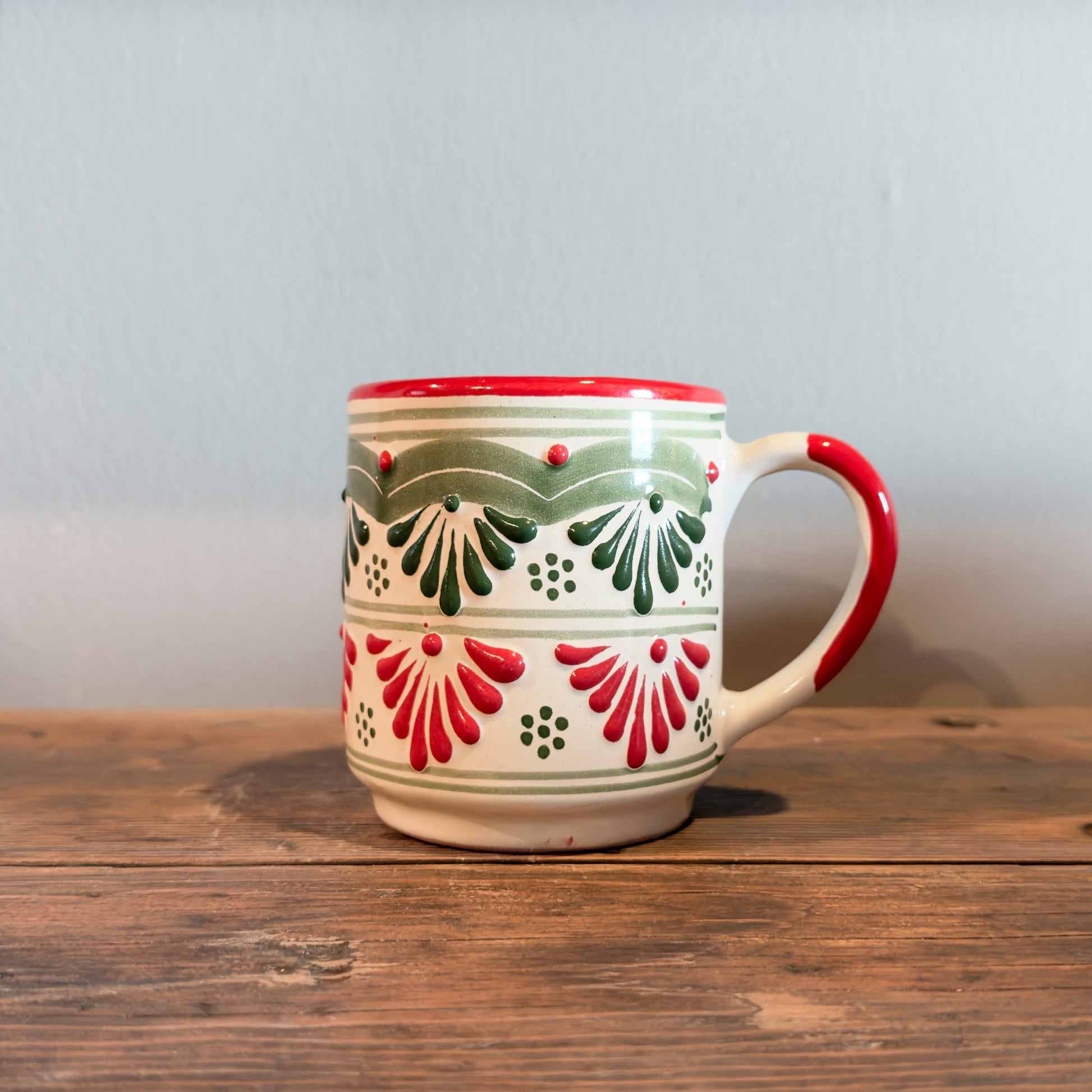Handcrafted and hand-painted in Mexico by skilled artisans, this Mexican talavera mug features a timeless red and green floral design that celebrates heritage, warmth, and everyday beauty.