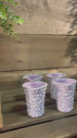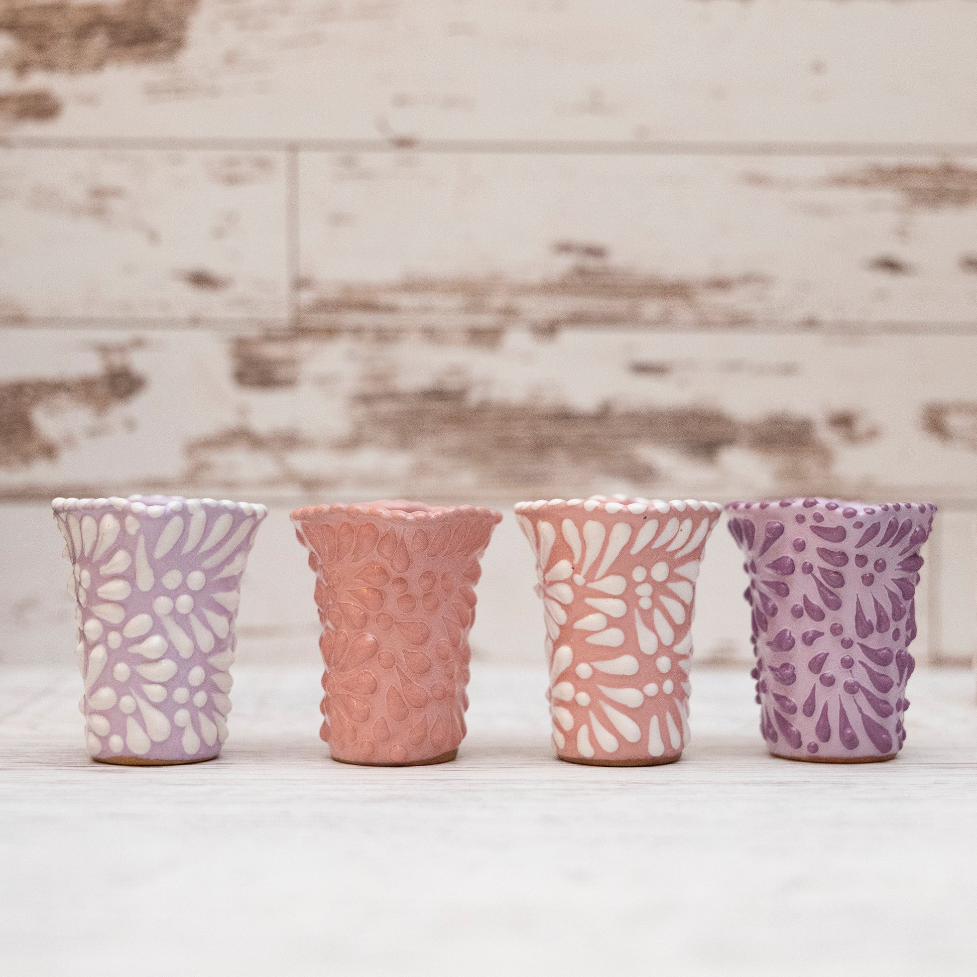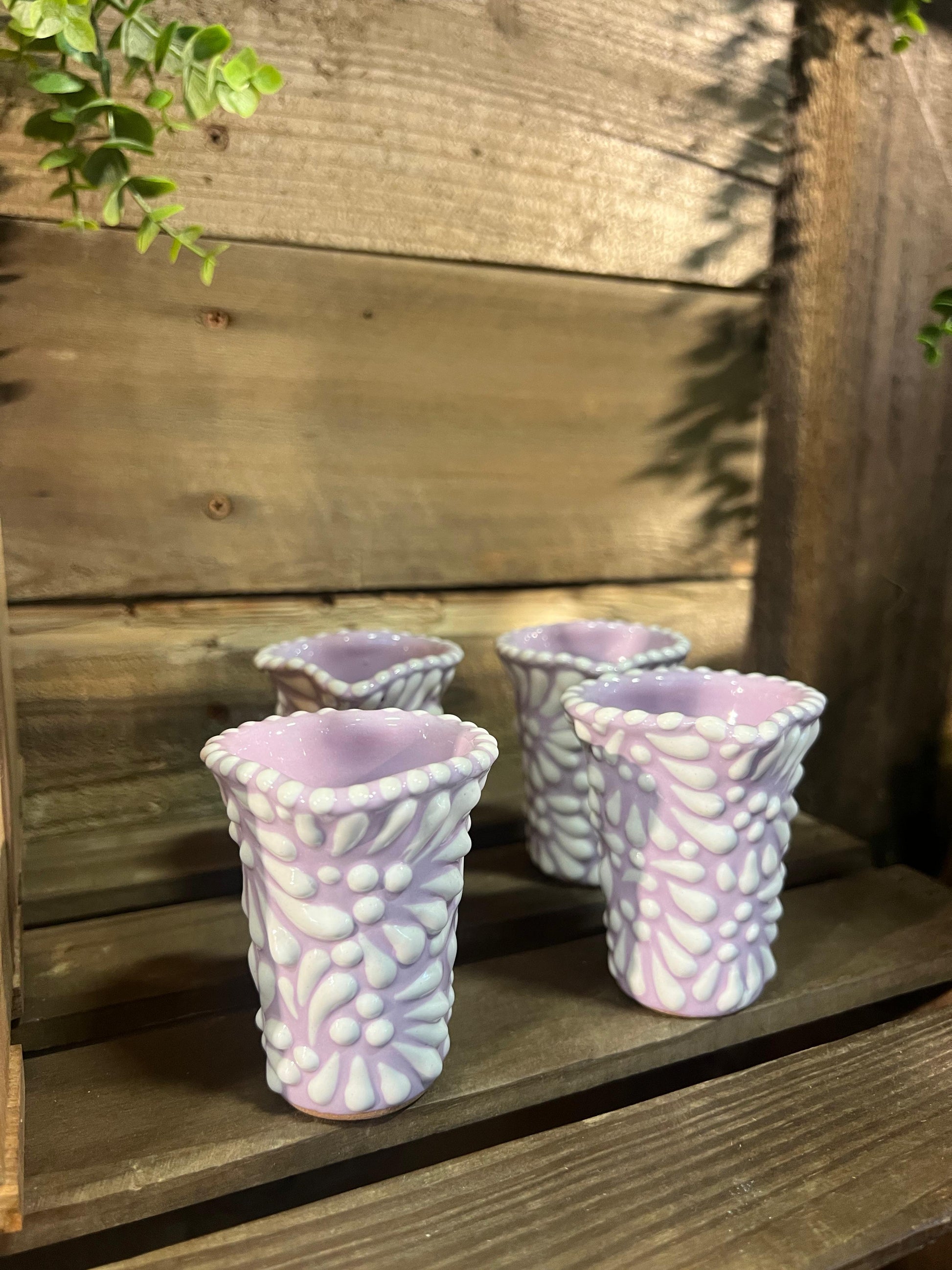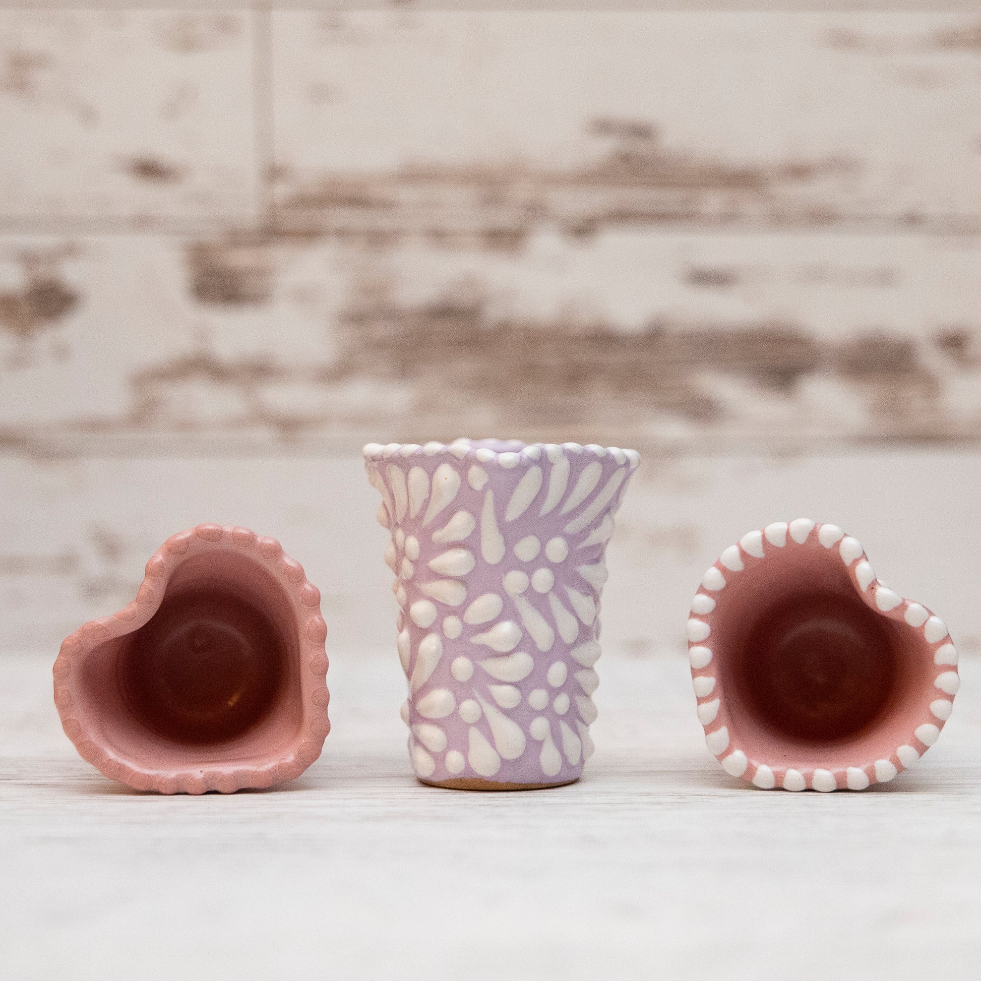 Meet our handcrafted heart-shaped talavera shot glasses โ white on lilac floral textured, and made with love.