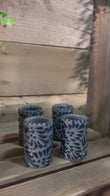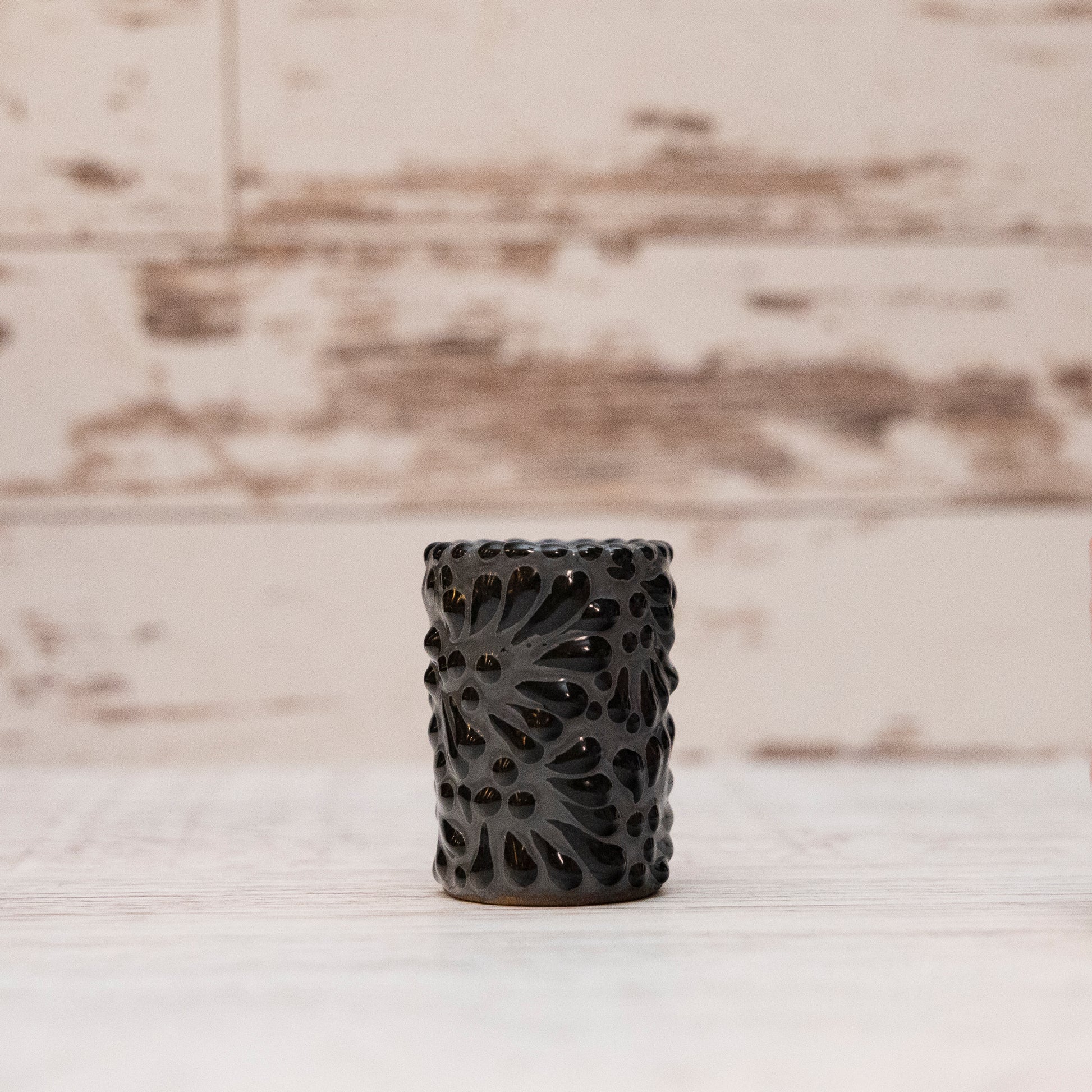 Meet our handcrafted talavera shot glasses — black on gray, floral textured, and made with love.