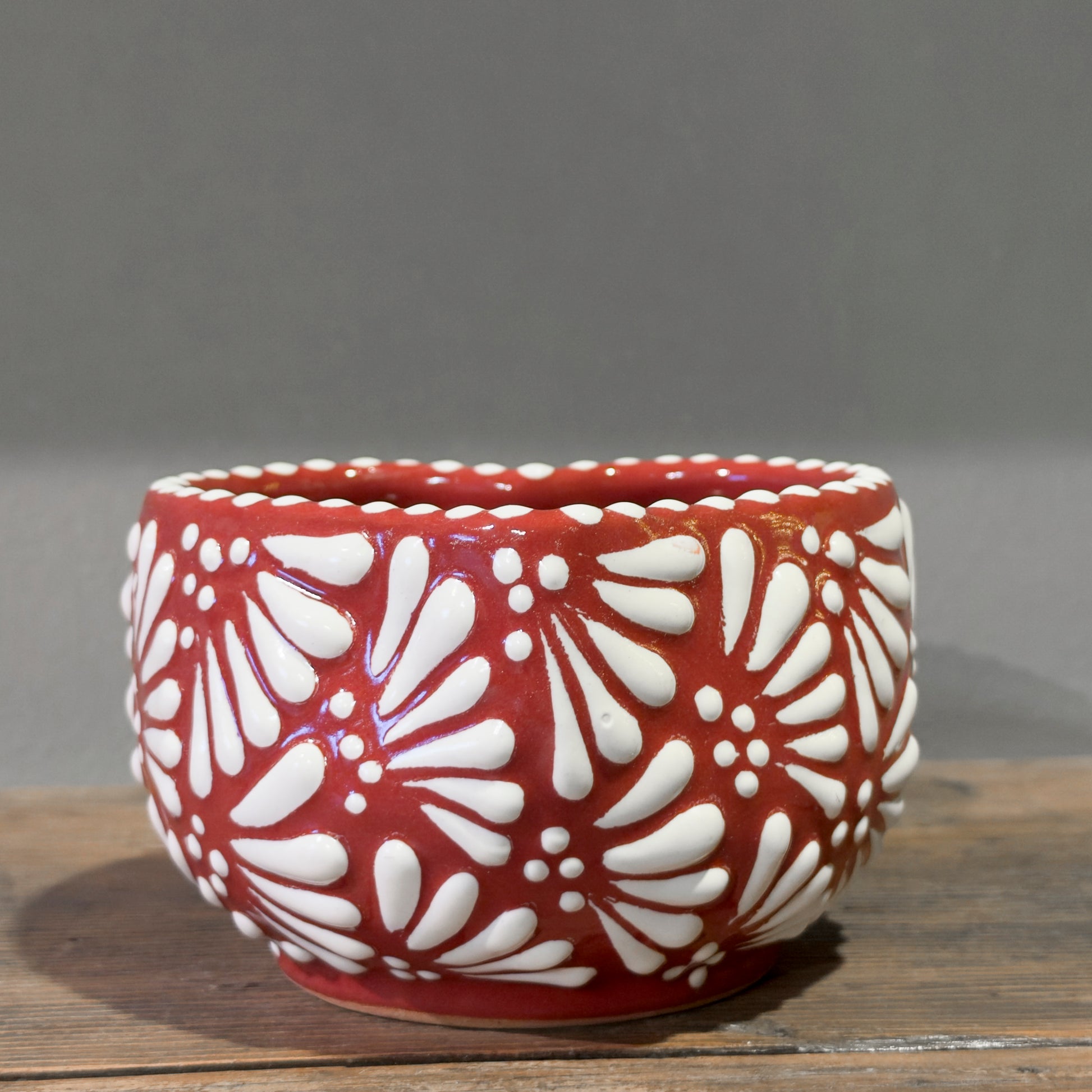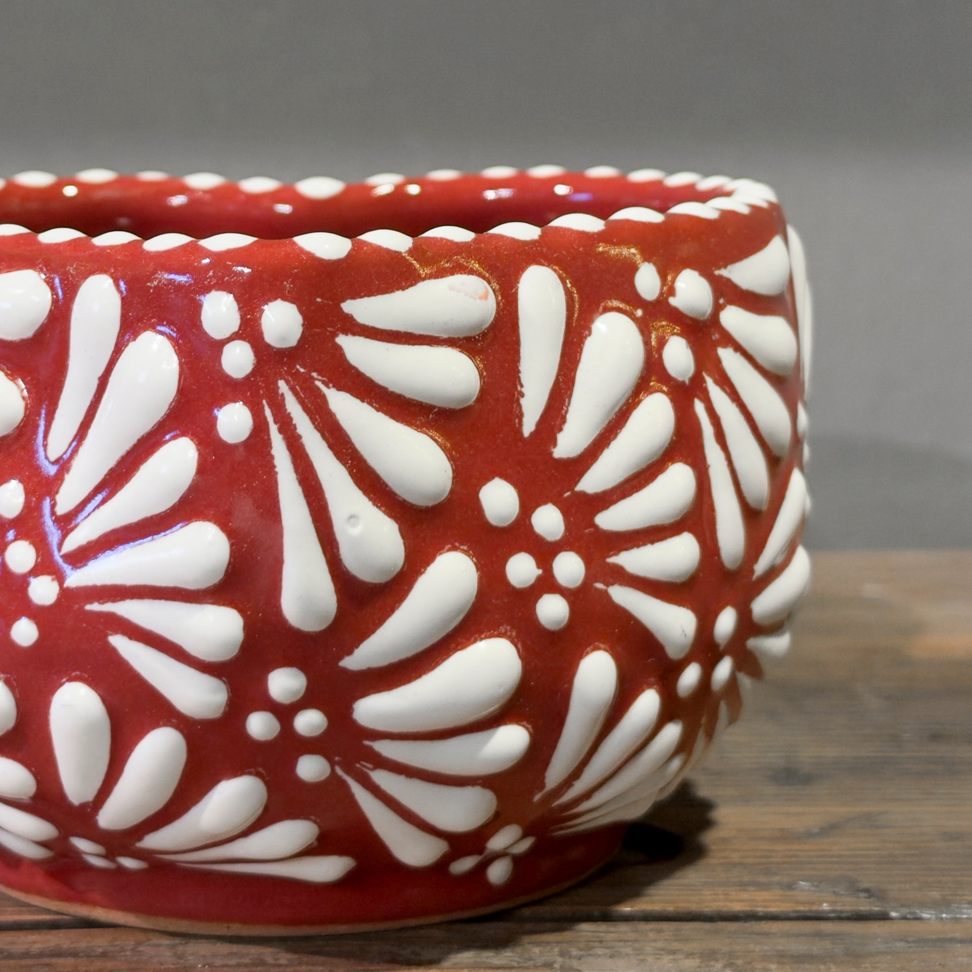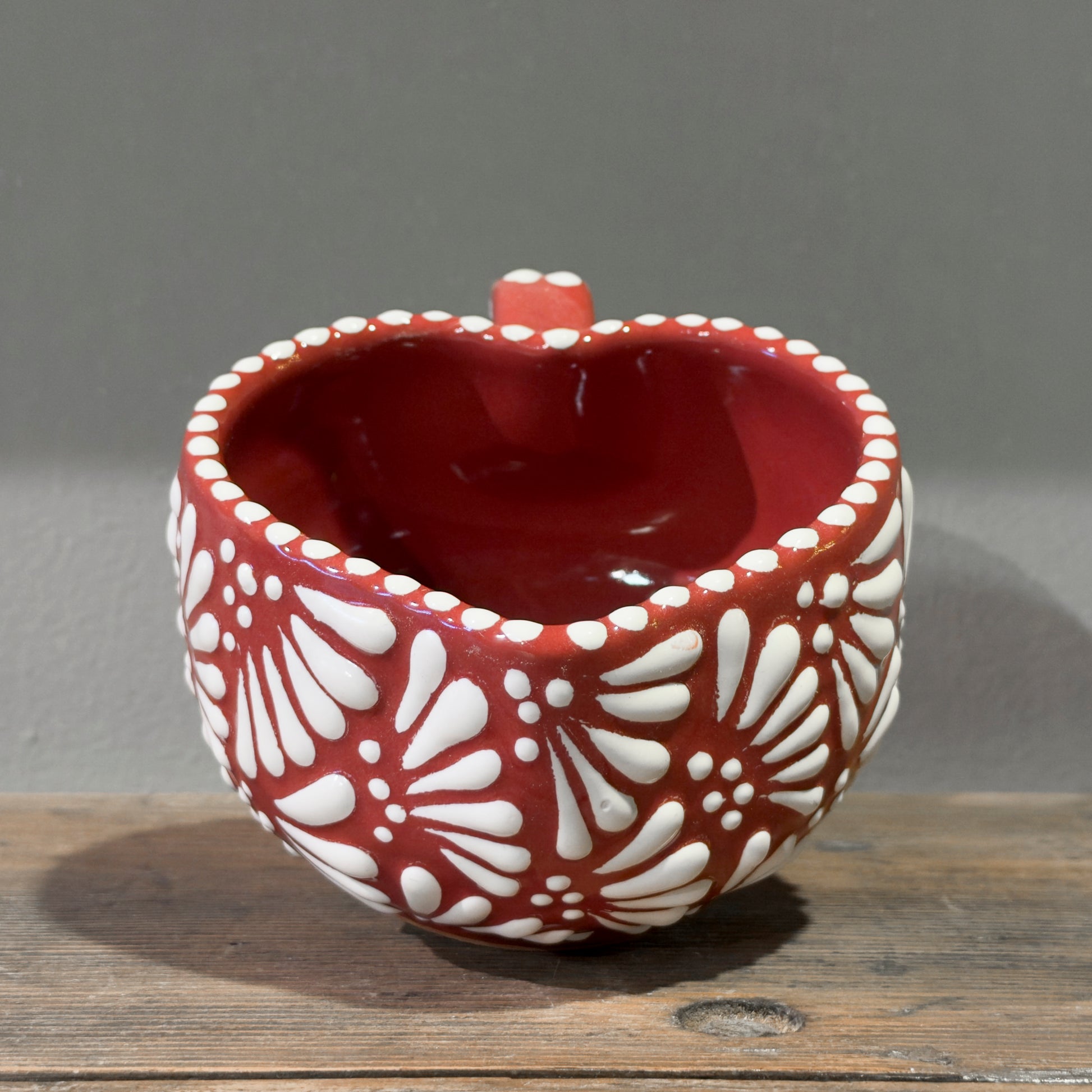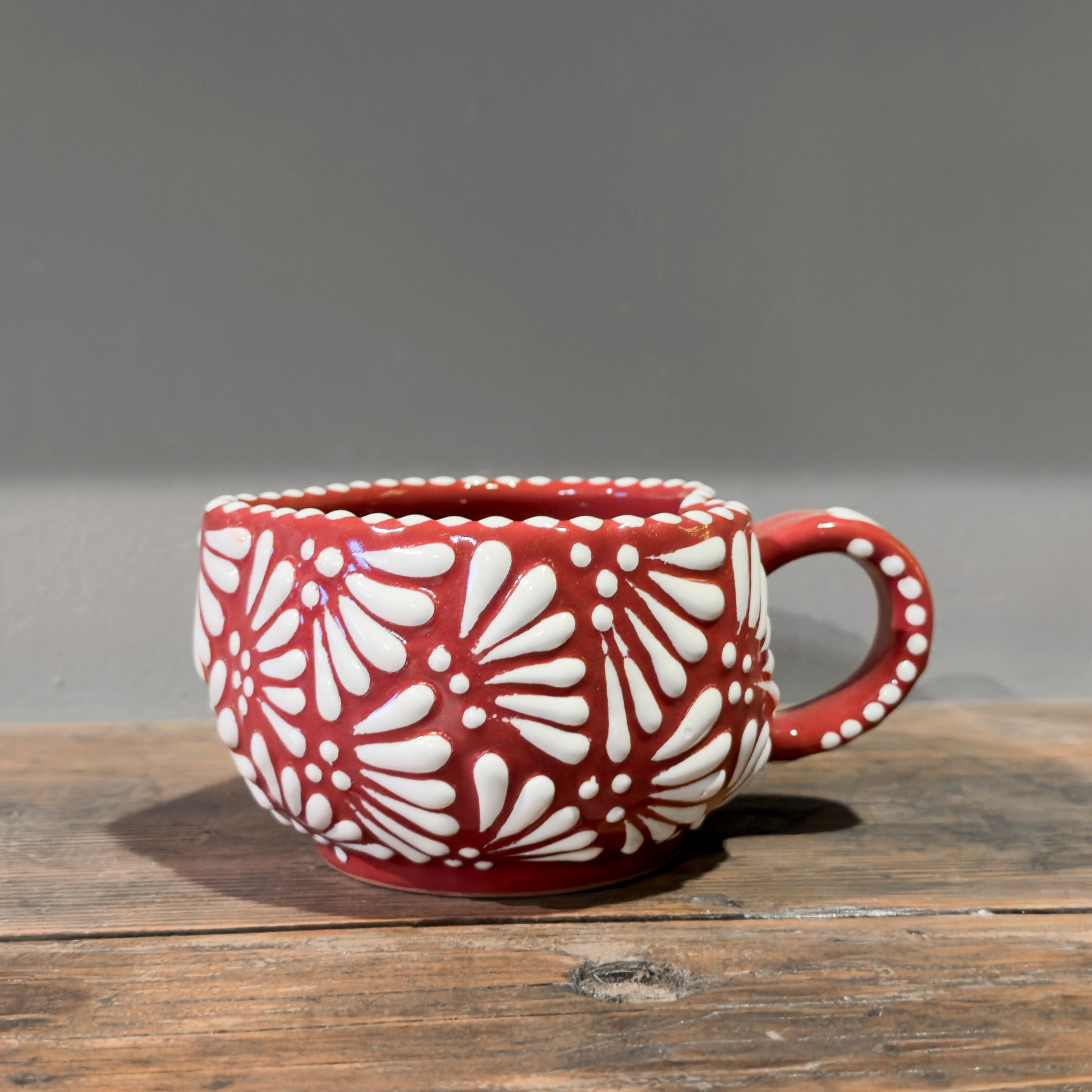 This Red Heart Mug is handcrafted and hand-painted by Mexican artisans, shaped entirely like a heart and finished with a bold red glaze and raised white detailing. The sculpted form and glossy interior make it as striking in your hands as it is on the table.